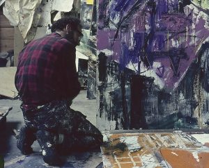 Unbekannte:r Fotograf:in: Emilio Vedova bei der Vorbereitung eines »Plurimo« in seinem Atelier im Berlin-Dahlem (heute Kunsthaus Dahlem), 1964. © Fondazione Emilio e Annabianca Vedova, Venedig.